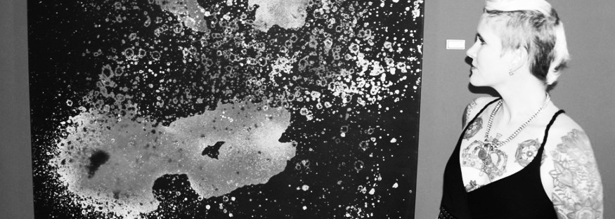 Born of a mutual epiphany, accidental art on a black sheet in the darkness. Tangible evidence of a journey, a passage of time; evidence of release and ecstasy. The truth and reality of an event captured mid-rapture and then in physical perpetuity. Powdered paint sprinkled over a canvas awaiting its hydration and using the sprays of ejaculate fluid as a catalyst for activation. As the mixture of paint and mysterious fluid dried, we observed the spontaneous formulation of nebulae, fractals, self-similarities with geographical maps. The longer we searched this textured landscape, the more we found.