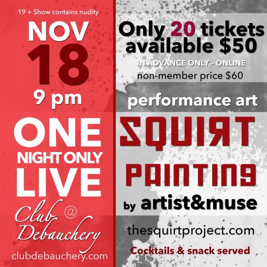 Artist & Muse will be creating their first LIVE squirt painting in years and they would like to share this unique experience with a few curious onlookers. Join us at Club Debauchery Ottawa for this ONE NIGHT ONLY live performance art creation of a squirt painting. Cocktails & light refreshments will be served at this event.